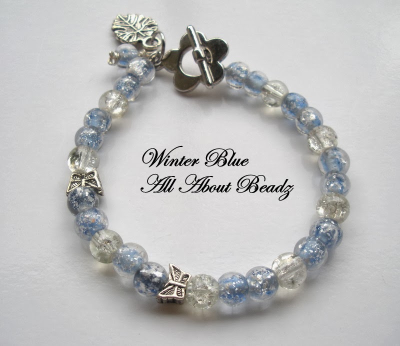 I adorned the wire, which I had bent to represent like a stylized 'A' shape, with cobalt and aquamarine Chinese glass crystals and small silver lampwork beads that catches the light and creates a prism of colors. It dangles from two rings which I had more blue and white crystal dangles attached which added movement to the bookmark when it hovers prettily outside the book.